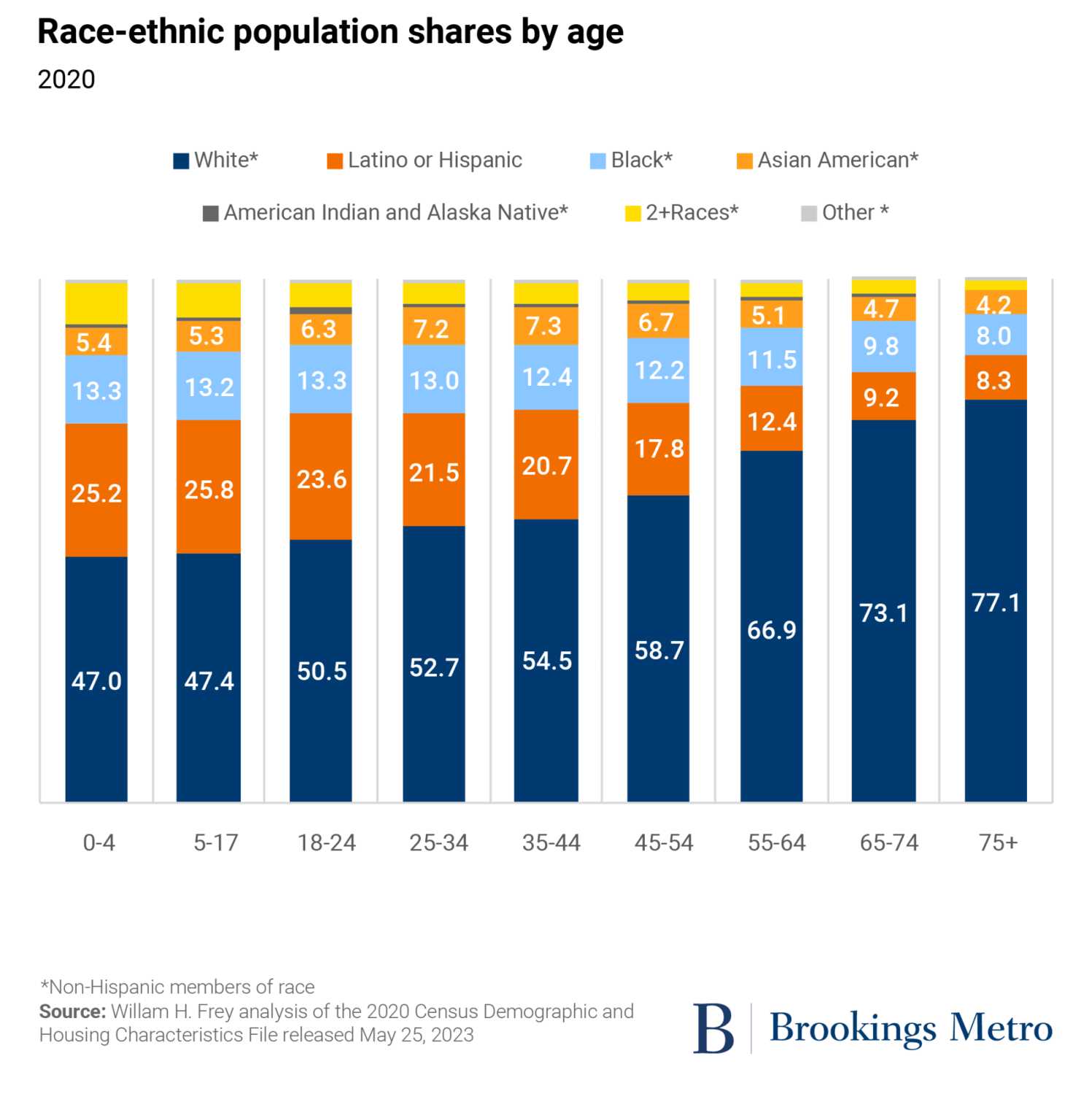 Another seismic demographic shift that is relevant to the nation’s future is the rise of its racial and ethnic minority populations. The 2020 census showed declines in the country’s aging white population over the previous decade, such that minorities account for all of the nation’s population growth and now comprise more than 40% of the national total. Yet aging is not race-neutral. As the white population ages out of younger age groups, racial and ethnic minorities—including Latinos or Hispanics, Asian Americans, and persons identifying as two or more races—have been filling the gaps. (see Figure 2.)