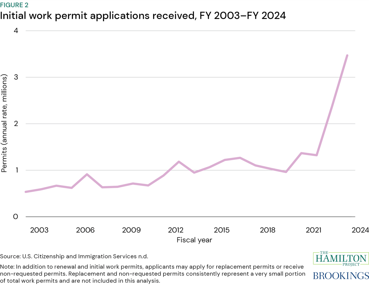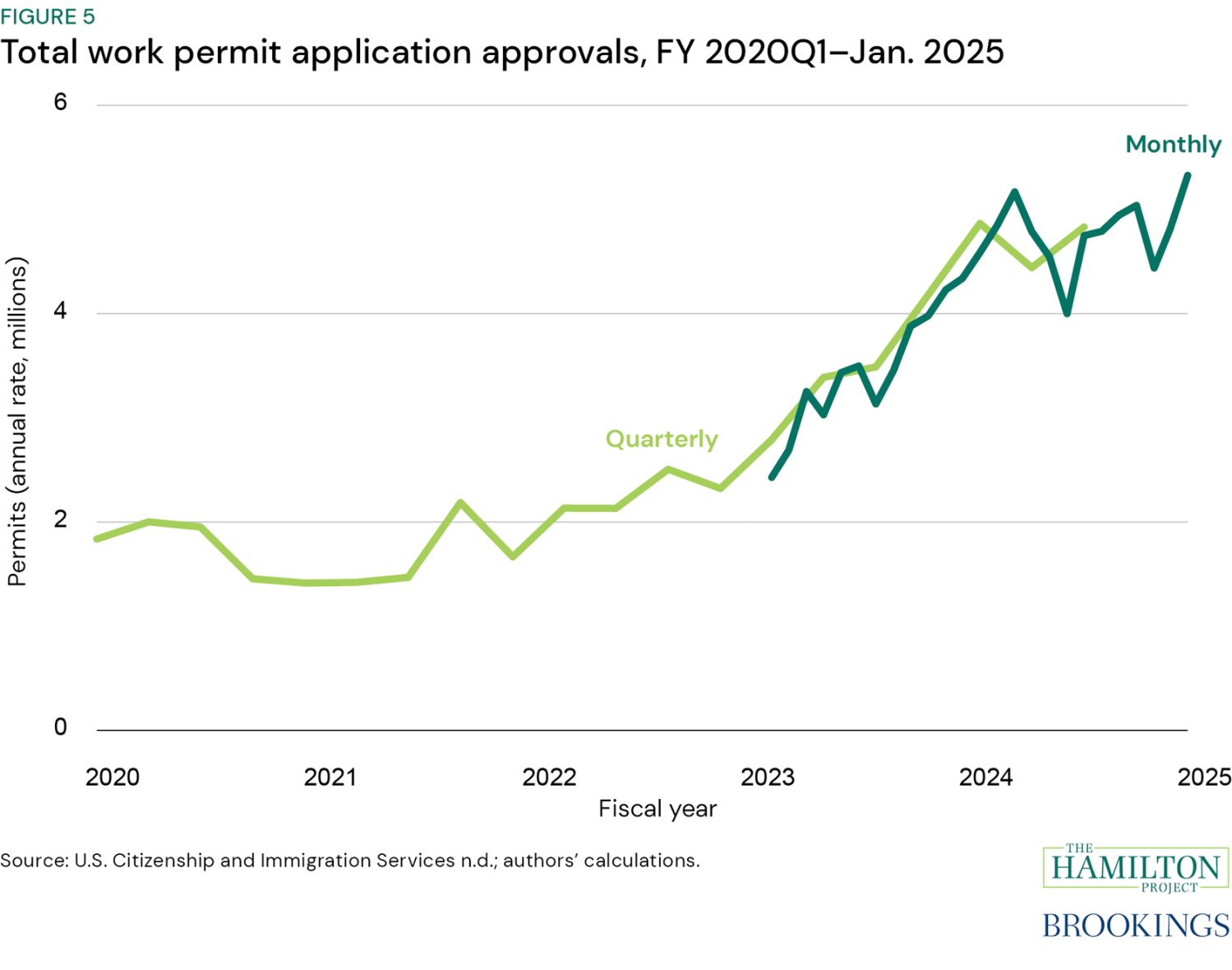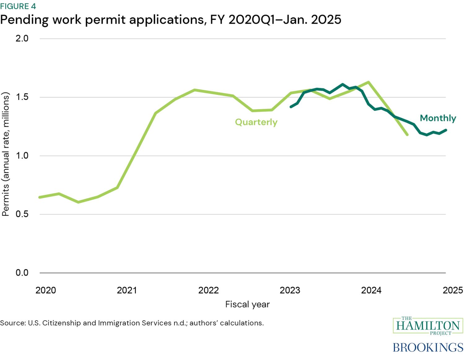 Work permits provide a provide a partial but close to real-time measure of recent immigrants taking steps to enter the workforce. To be sure, some immigrants eligible to apply for work permits start working before their permits are approved or continue after their permits expire. And many undocumented immigrants ineligible for work permits nonetheless work in the labor market. Still, the work permit data are a useful indicator of growth in labor supply.