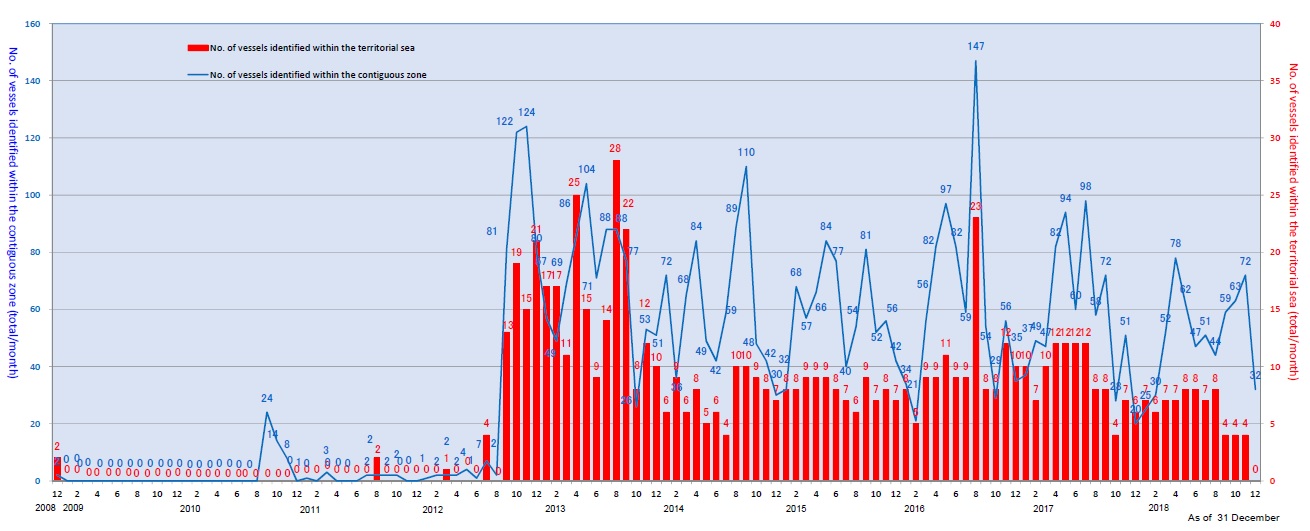 - China launched its first program of “regular rights defense patrols” in the East China Sea in 2006, coinciding with the unilateral development of the disputed Chunxiao gas field. In December 2008 PRC government ships made their first foray into the 12 nautical mile zone around the Diaoyu Islands, and over the following 18 months unilateral Chinese development at Chunxiao resumed despite a bilateral agreement the previous year, and Japanese officials complained of “extremely dangerous” conduct by PRC maritime law enforcement units in the disputed area.