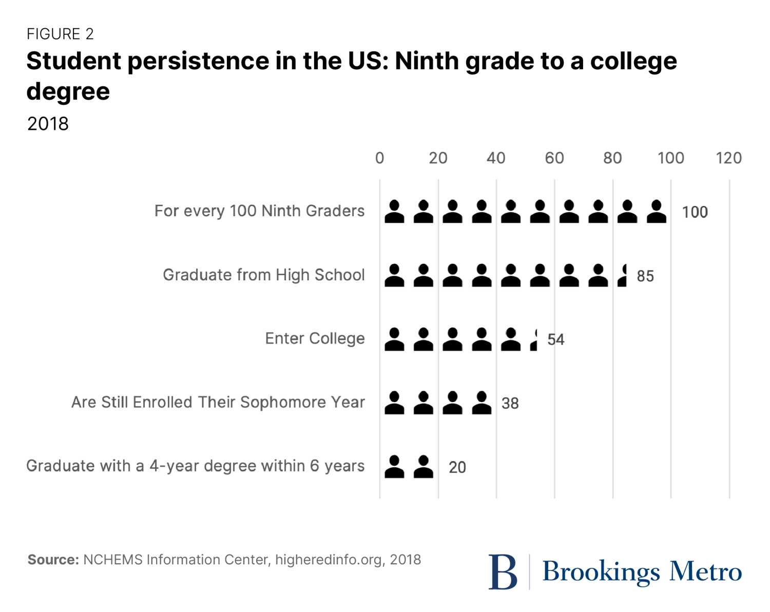 The entire educational pipeline is leaky, as Figure 2 shows. Individuals drop out of the college track before high school graduation, after high school graduation, and after enrolling in college. For every 100 ninth graders, only 20 have earned a four-year degree six years after high school graduation. What options are there for the other 80?