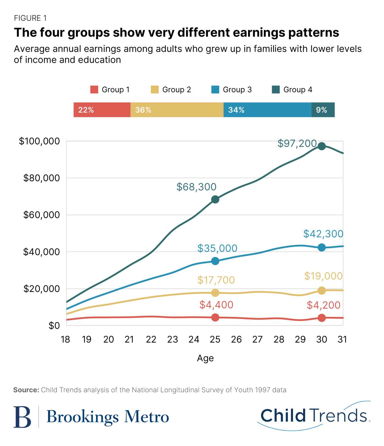 Two of the groups experienced absolute economic hardship throughout their 20s and up to age 30. As shown in Figure 1, average annual earnings for individuals in Group 1 were $4,000 at age 30; $19,000 for Group 2; $42,000 for Group 3; and $97,000 for Group 4. The two lowest-earning groups are quite large: Group 1 accounts for 22% of the study population, or 2.5 million people, and Group 2 accounts for 36% of the study population, or 4.1 million people. Together, they account for nearly 60% of the study population.