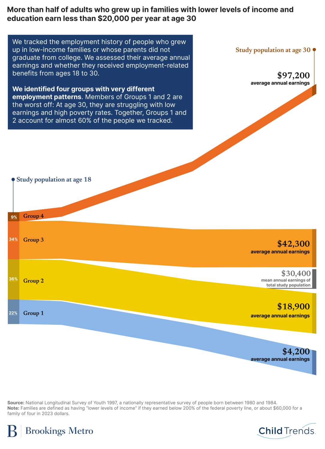 Brookings partnered with Child Trends to look more closely at the factors shaping upward mobility during a formative period in people’s lives: their teens to age 30. We wanted to get a fuller picture of whether people from families with lower levels of education and income find steady, decent-paying employment in adulthood. To do that, we identified teens whose parents did not graduate from college or who grew up in families earning below 200% of the federal poverty line (about $60,000 for a family of four in 2023 dollars). We followed this “study population” from age 18 to 30 to assess their average annual earnings and whether they received fringe benefits through their employer.