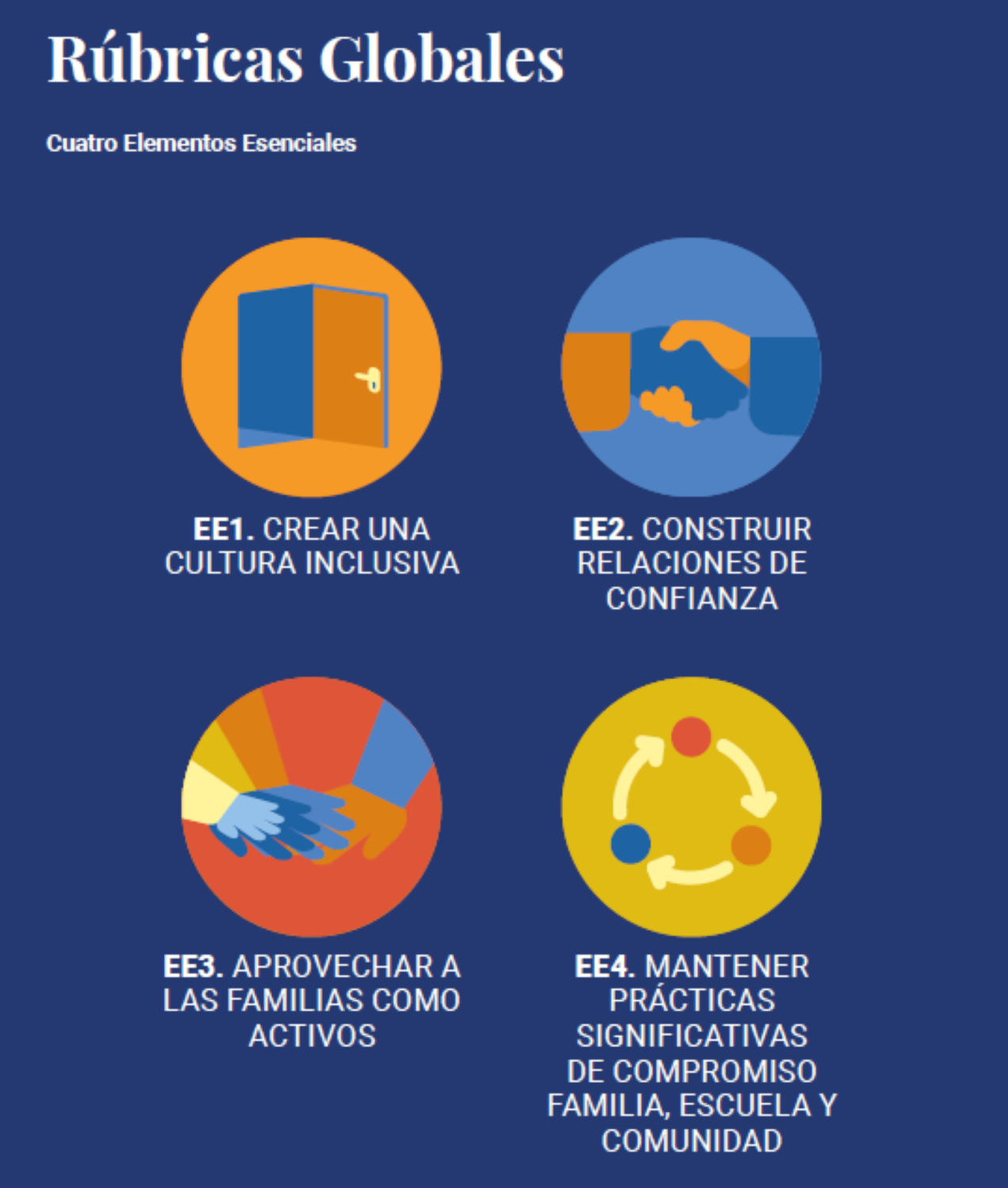 Los cuatro elementos esenciales son: 1) crear una cultura inclusiva, 2) construir relaciones de confianza, 3) aprovechar a las familias como activos y 4) mantener prácticas significativas de compromiso familia, escuela y comunidad.