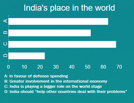 Finally, it is noteworthy that Indians seem conflicted about the country’s global role. The survey reveals that average Indians are very much in favour of defence spending (63 per cent) and greater involvement in the international economy (52 per cent), and they believe overwhelmingly that India is playing a bigger role on the world stage (68 per cent). However, they do not yet believe that Indian power should be used to “help other countries deal with their problems” (23 per cent). But perhaps these views – both pride and caution about a greater international role – are normal for a rising power such as India.