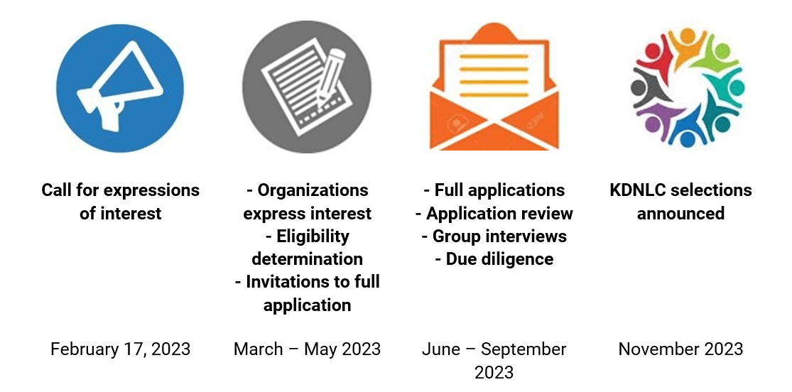 The KDNLC full application process had five key steps that aimed to ensure a rigorous and fair review. The process described below supported the selection of the 10 KDNLC member organizations.