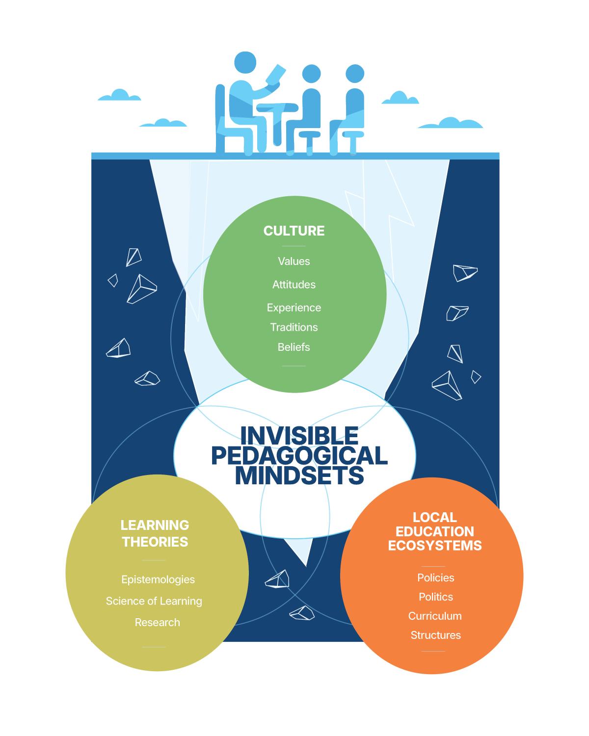 The act of teaching is the visible part of pedagogy—the tip of the iceberg. But beneath the surface, elements such as culture, local education ecosystems, and learning theories inform teachers’ choices and shape the teaching and learning experience. We use these three categories to encompass what we define as Invisible Pedagogical Mindsets: the multifaceted, interconnected, and unobservable elements that impact pedagogical approaches in the classroom.