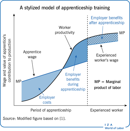 - The mix of activities the apprentice does and the duration of the training period. The share of time spent in the on-the-job component doing firm-specific and productive activities increases benefits to employers in the short run. However, firms can also benefit from investing in more general skill training if that learning leads to greater productivity increases over time.